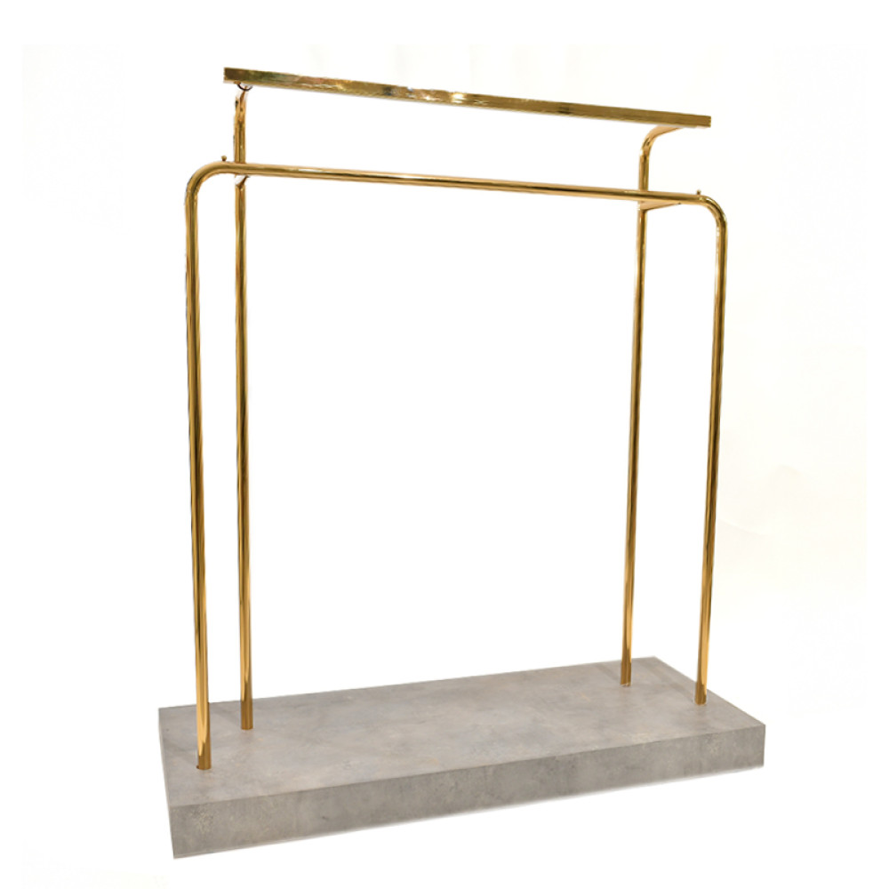This gold rack features an elegant design and modern aesthetic. The top bar is suitable for LED lighting, which showcases the clothes impressively, making them stand out with style and brilliance.